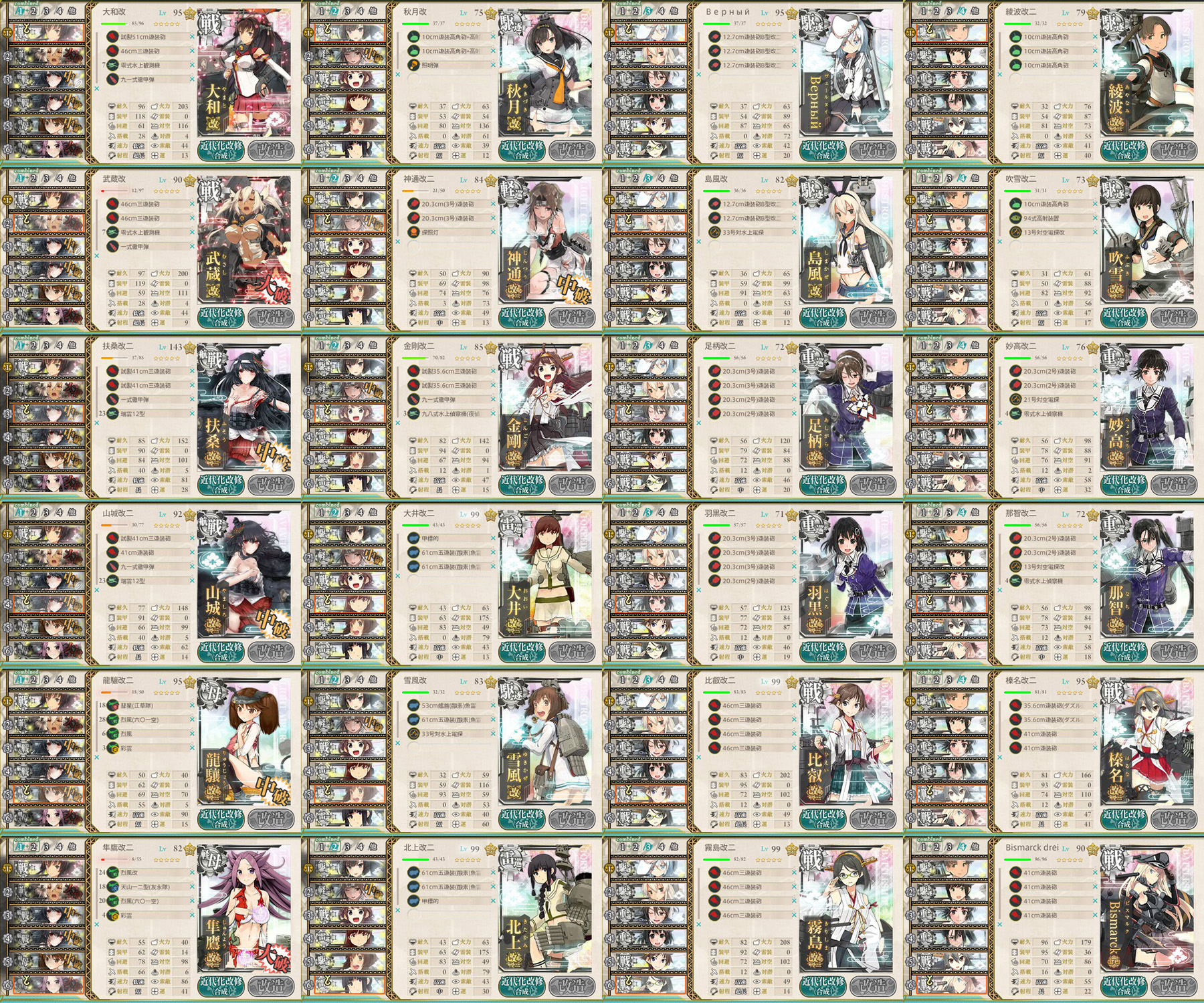 個人記念用に編成まとめ。第三艦隊が決戦支援、第四艦隊が道中支援。見よこの比叡霧島の論者積みを…効果あったようには思えないけども 支援艦隊も命中上げないと当たらないんだっけ?まあもう全て終わったからいいやー勝ったどー!トリプルダイソンの悪夢は見ない