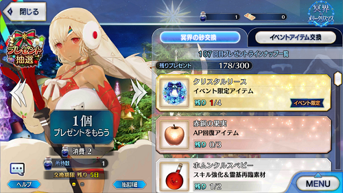 こちら2017クリスマス最終記録になります 107箱+122回…どうせなら煩悩の数開けたかったものですがそれもこれも全ては最終日の接続障害が悪い、あれさえなければ110箱は開けてた まあ当初の100箱開けるという目標は達しましたのでよしとします シープ礼装もぴったり3枚凸れましたので来年また使えるだろう…回数制限かかるだろうけど…