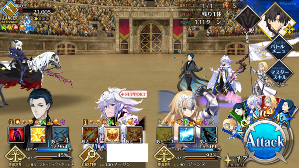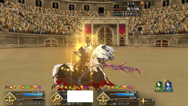 そこからはとにかくジャンヌのNPを溜めること、次いでマーリンのNP、更にオマケでホームズのNPを溜めるよう回していきます スキルはまだ全部温存ですがジャンヌのS1は出しておきます(よく忘れる)
