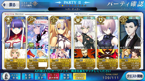 マシュの礼装がアレなのはご覧の通りコスト上限に引っかかったせいです そらこんだけ☆5鯖と☆5礼装盛ってたらこうなるわな!ていうか勘違いしてたけどうち王聖凸ってなかったわ!