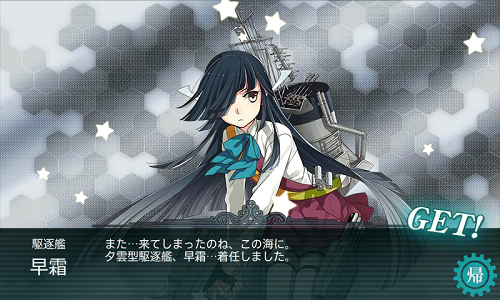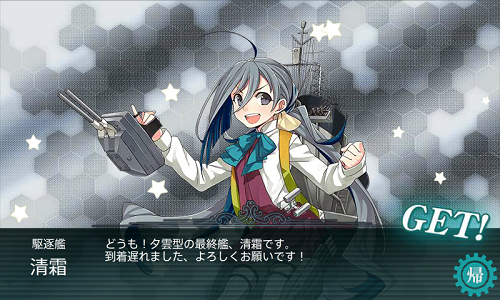 で、早霜お迎えしたことだしと一発大型回したら4時間だったよ^^清霜が武蔵さん武蔵さんて言うから早く来てあげてよ武蔵!いい加減たけぞうって呼ぶぞ!!