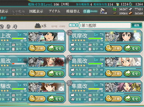 道中もまあこれきつくてきつくて 索敵値も相当高くないと逸れる…びええ…基礎値じゃなくて装備による値だっていう話も聞いたけどどうなんだ…とねちくの両方は勿体無いので筑摩さんだけ出てもらってましゅ